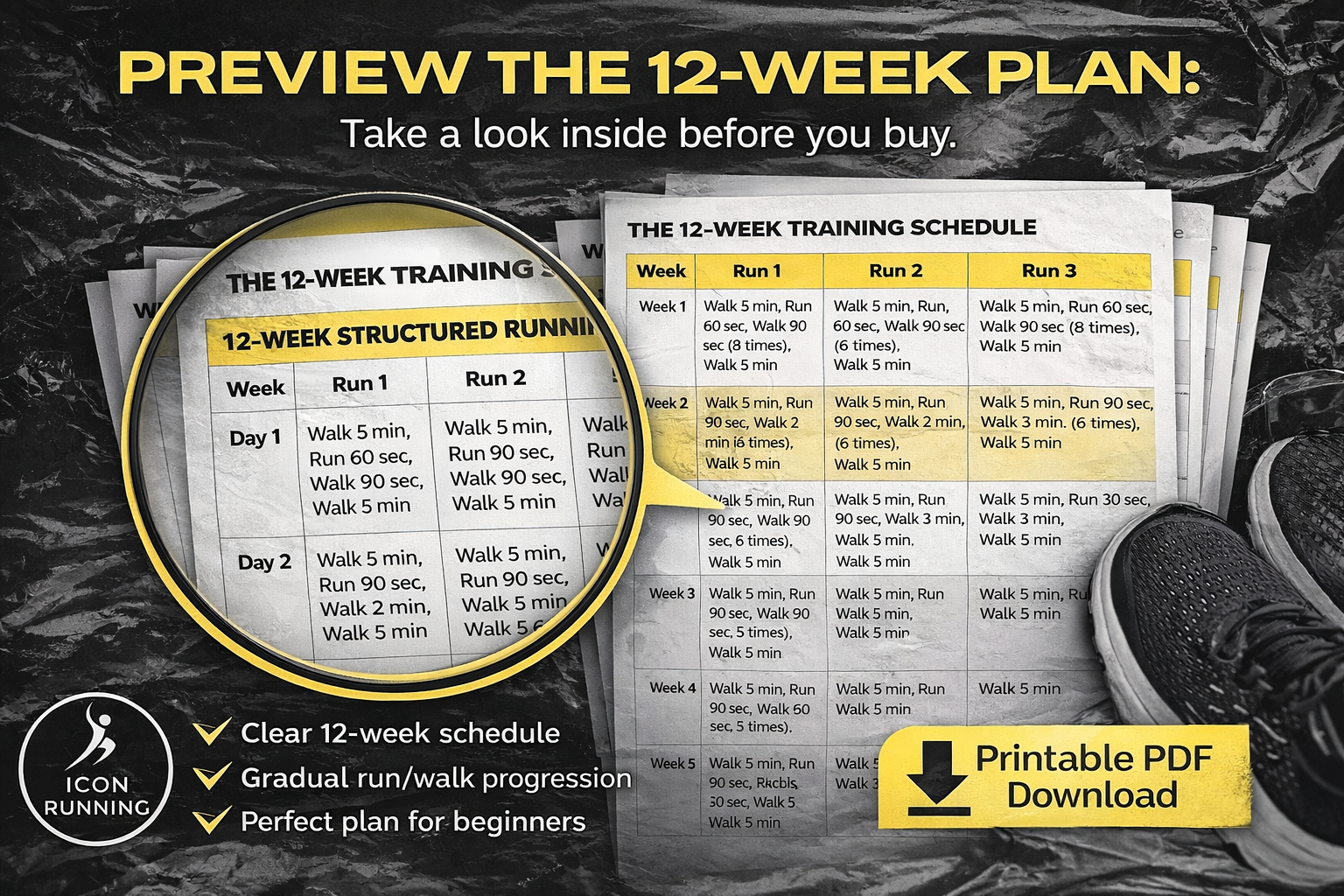 The guide includes structured, progressive weekly training plans that focus on gradual improvement. Each week balances walking, jogging, and recovery periods to suit your pace, ensuring progress without burnout. No matter your initial fitness level, this guide helps you stick to your goals.